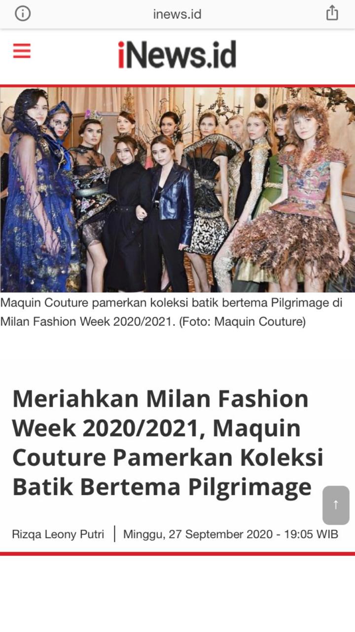 Ils sont les premiers créateurs de mode indonésiens à présenter Batik à un défilé de mode international – Maquinn première à la Fashion Week printemps-été 2020/2021 de Milan.Leurs collections ont été magnifiquement présentées au Palazzo Visconti, en collaboration avec un styliste italien. Le titre est Collection Pilgrimage qui représente l’ouverture de la porte du jardin sacré interdit, par la création d’Adam & Eve et la tentation. De l’Asie de l’Est correspond à l’Asie du Sud créative peinte à la main avec de l’encre d’or appelée batik prada, judicieusement choisie pour correspondre à la culture caucasienne et anglo-saxonne interprétée par des couleurs royales comme l’or, le bleu saphir foncé, le vert émeraude, perlé soigneusement avec une grande couverture en strass de luxe conception de texture qui représente de nombreux visages par tentation.